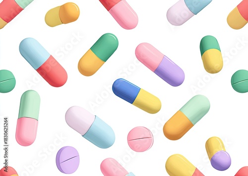 capsule, tablet, medicine, pill, drug, health, treatment, health care, pharmacy, colourful, pattern, seamless, background, white, three-dimensional, design, illustration, graphic, art, isolated, medicals, drugged, remedy, medication, vitamin, supplement, wellness, make well, disease, disease, healing, therapy, assorted, mixed, scattered, vibrant, shades, light, pastel, floating, random, abstract, blend, closeup, studio, composition, rendering, relief