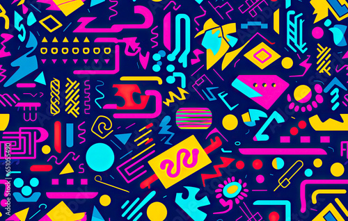 Colorful 90s seamless art collage with bold abstract shapes and colors. For wall art, covers, interior decoration, and backgrounds. Repeatable or tiled texture.