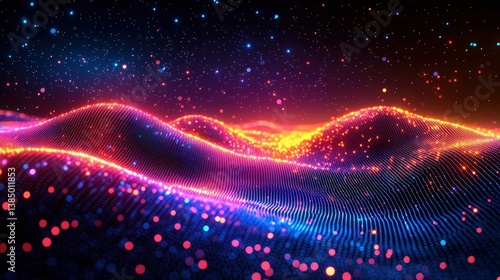 Colorful Abstract Digital Landscape with Glowing Lights and Starry Night Sky