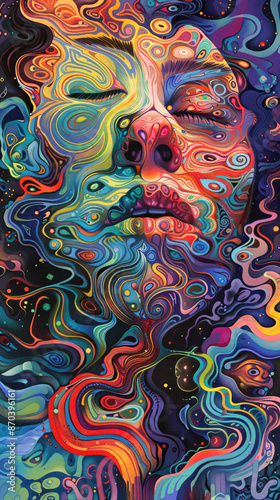 face, colourful, intricate, swirling, pattern, abstract, mysticism, emotion, energy, art, vibrant, human, aethereal, detail, expression, design, surrealism, modern, cosmic, imagination, dream, fantasy, creativity, passion, spirit, fire, water, air, earth, harmony, oneness, balance, aura, spirituality, galaxy, universe, nebula, hallucinogen, swirl, flow