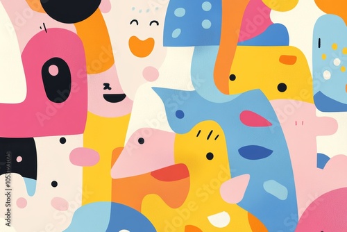 Colorful abstract illustration featuring playful animal shapes and friendly expressions in a whimsical design