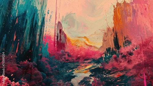 Colorful abstract painting. Landscape with mountains and trees