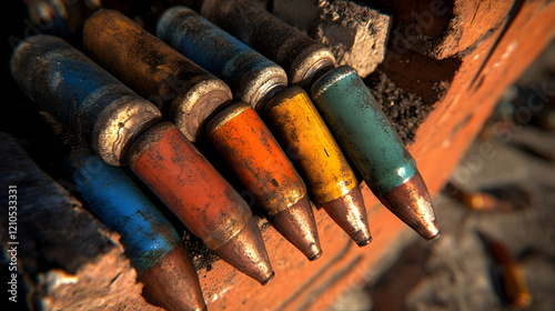 munition, war, remnant, colourful, bullet, military, conflict, weapon, destruction, battlefield, cartridge, shell, army, fight, battle, combat, danger, explosive, firearm, power, violence, crisis, soldier, fighting, defense, attack, threat, global, international, peace, hope, future, humanity, safety, security, survival, risk