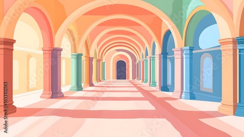 red, modern, illustration, column, purple, space, green, corridor, bright, colourful, decorative, art, pink, background, pastel, design, orange, texture, hallway, vibrant, passage, pattern, interior, shadow, architecture, empty, blue, beige, style, yellow, colonnade, perspective, light, geometric, arch