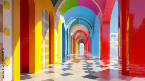 archway, colourful, architecture, design, rainbow, perspective, future, journey, hope, vibrant, bright, chequered, floor, sky, cloud, optimism, opportunity, pathway, corridor, passage, abstract, modern, surreal, art, three-dimensional, illustration, graphic, digital, colours, light, shadow, geometric, pattern, success