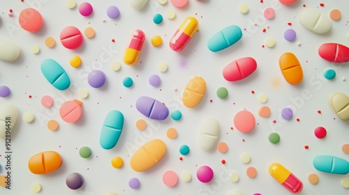 Colorful array of pills spilling onto a light grey backdrop, with bright colors contrasting against the neutral background.