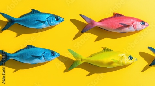 fish, colourful, artificial, yellow, background, vibrant, arrangement, texture, marin, decoration, ocean, blue, red, design, playful, prop, studio, creative, photo, aquatic, decor, art, display, tropical, summer, fun, nature, wildlife, oceanic, bright, visual, fresh, environment, beauty, pattern, unique, style, fishery, underwater, market, exotic, collection, aesthetic