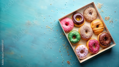 Colorful assorted donuts arranged in a decorative box on a soft pastel blue background with subtle glitter effects, baked goods, colorful treats