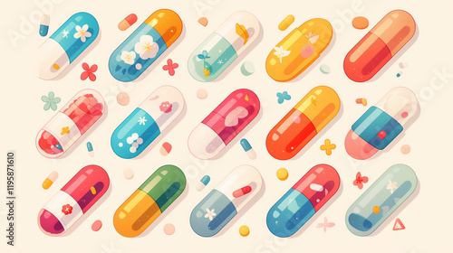 capsule, colourful, decorative, floral, pattern, vibrant, design, assortment, grid, health, medicine, drug, illustration, shape, creativity, wellness, art, pharmacy, feature, arrangement, substance, colours, treatment, herbal, supplement, modern, bright, cheerful, lifestyle, nourishment, graphic, therapeutic, beauty, aesthetic, pharmaceutical, optical, concept, care, alternative
