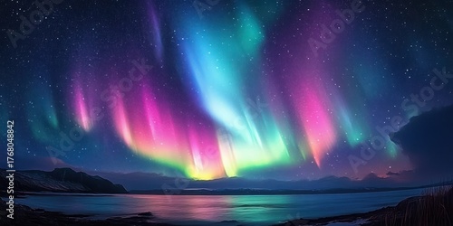 Colorful aurora borealis lights up the night sky above a calm lake with mountains and grassy shoreline under a starry sky creating a serene and magical atmosphere
