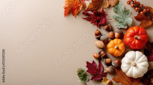 Colorful autumn leaves and acorns are arranged around small decorative squash on a light textured surface, showcasing fall's beauty