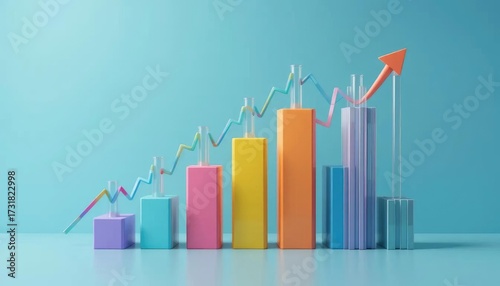 Colorful bar graph showing upward trend with an arrow pointing up, against a blue background.