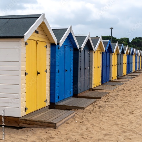 beach, hut, colourful, sandy, shore, row, wooden, blue, yellow, white, grey, ocean, house, summer, vacation, architecture, coastal, sea, bright, holiday, door, step, sky, cloud, perspective, line, horizon, panel, vacationing