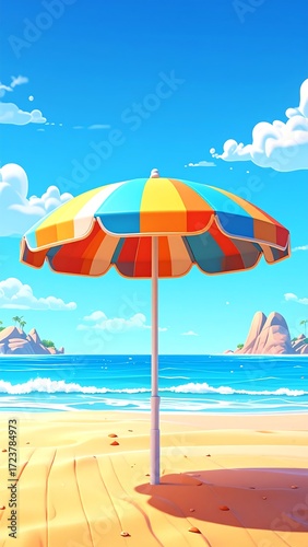 Colorful beach umbrella on a sandy shore. Vibrant summer scene