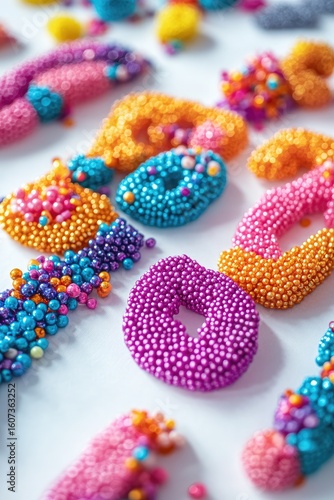 beaded, colourful, letter, shape, pink, orange, purple, blue, yellow, decorative, hand-made, art, design, creative, abstract, textured, three-dimensional, bead, bright, vibrant, unique, pattern, display, arrangement, closeup, detail, surface, white, background, composition, collection, artistic, modern, craft, geometric, eye-catching, visual, artful, texture, bold, intricate