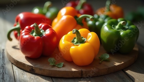 Colorful Bell Peppers on Wooden Board Fresh and Natural Food Still