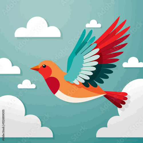 Colorful Bird Flying High-Whimsical Illustration with Clouds-Artwork for Kids-Bright and Cheerful Design-Digital Art for Children-Bird in Flight-Cloudscape Art-Optimistic Art