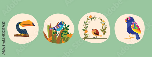 Colorful birds and floral, flowers, leaves hand drawn element decoration vector illustration. Set of bright birds collection isolated on background.