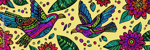 Colorful Birds and Vibrant Flowers in a Whimsical Design Showcasing Natures Beauty and Artistry
