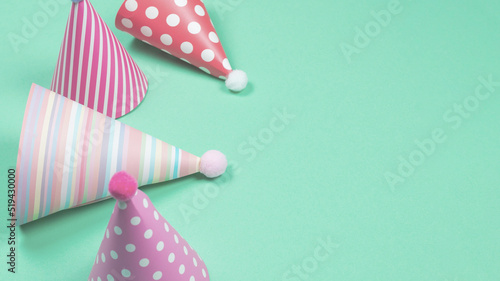 copy space, blue background, confetti, birthday, cap, carnival, celebration, children, colourful, entertainment, event, festival, festive, fun, happiness, happy, hat, hat, holiday, joy, mint, party, red, surprise, whistle, white