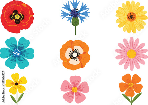 flower, floral, bloom, blooming, garden, botanical, nature, spring, summer, plant, flower petals, blossom, decorative, colourful, cute, illustration, vector, set, design, graphic, ornament, bouquet, wildflower, daisy, poppy, rose, beauty, natural, flat, clip art
