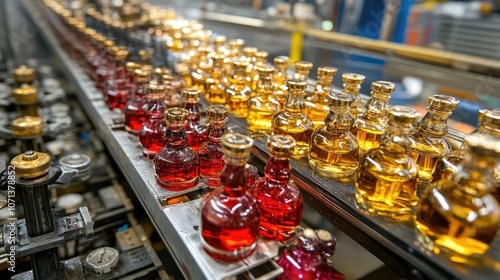 bottle, production, factory, conveyer, beverage, liquid, glasses, machinery, industry, workshop, manufacturing, colours, yellow, red, gold, processing, equipment, filtration, filling, cardboard box, distribution, detail, modern, assembly, row, shape, content, container, cap, technology, supply, process, quality, design, surface, metal, art, arrangement, style, light, visual, aesthetic, scene, workflow, environment, setting, closeup, natural