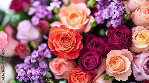 Colorful bouquet of fresh roses and purple flowers, perfect gift for International Womens Day, Mothers Day, Valentines Day, love, appreciation, floral arrangement.