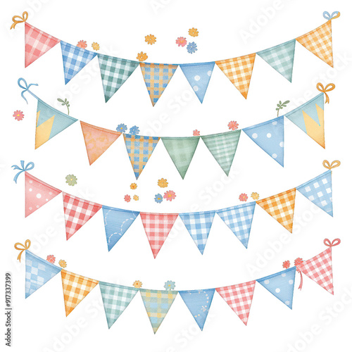 Colorful bunting flags with playful designs perfect for festive celebrations, parties, or creative projects. transparent background