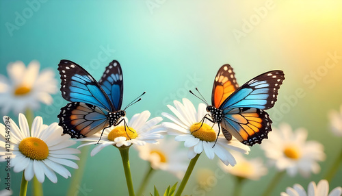 Colorful butterflies in various shades of blue, orange, and black are scattered among white daisies and yellow flowers, set against a gradient background transitioning from light blue to soft yellow