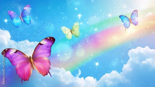 Colorful butterflies soar against a vibrant rainbow and sparkling sky.