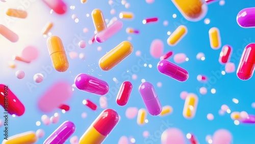 capsule, pill, medicine, health care, pharmacy, medication, drug, treatment, therapy, health, wellness, colourful, vibrant, bright, blue, sky, floating, falling, background, texture, pattern, abstract, design, graphic, illustration, medicals, pharmaceutical, science, technology, glossy, shiny, semitransparent, transparent, pink, orange, yellow, red, purple, sphere, dot, particle, light, sun, bokeh, airy, weightless, motion, dynamic