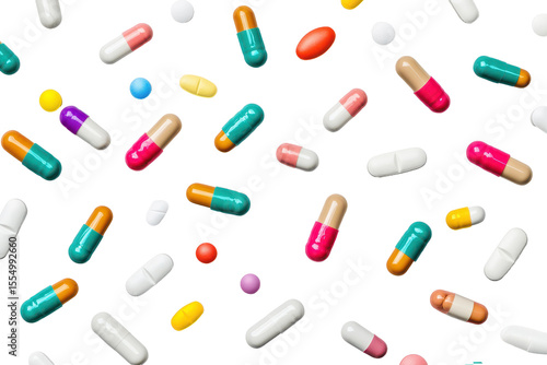 Colorful capsules scattered on a white surface in various shapes, sizes, and colors, creating a lively and vibrant display of pharmaceutical products