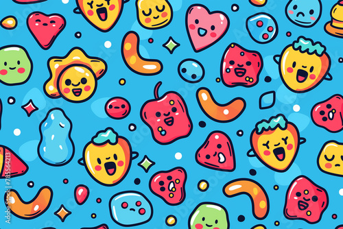 cartoon, food, character, colourful, blue background, whimsical, playful, vibrant, happy, illustration, design, pattern, cute, animated, cheerful, dessert, fruit, snack, creative, art, fun, joy, vivid colors, drawing, digital artwork, graphic, smile, emotion, adorable, quirky, fantasy, texture, diverse, variety, artwork, joyful, sweet, lively