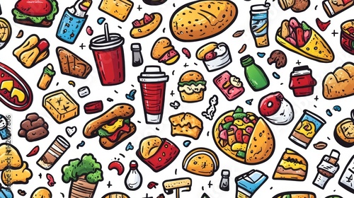 fast, food, cartoon, illustration, burger, fries, soda, drink, taco, sandwich, donut, bread, enclosed, dessert, hot drink, bottle, ketchup, mustard, salt, pepper, seasoning, pastry, ice, cream, cake, pizza, hot dog, snack, lunch, dinner, meal, take-out, delicious, tasty, drawing, artistic, style, fun, cheerful, white, background, colourful, isolated, design, pattern, cute, sweet