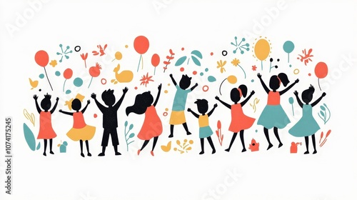 children, balloon, celebration, happiness, joy, illustration, silhouette, flower, play, colourful, festive, party, togetherness, fun, excitement, design, cheerful, creative, artwork, group, diversity, motion, enjoyment, activity, festival, youth, carefree, laughter, community, friendship, vibrant, artistic, playful, summer, imagination, freedom, whimsy, nature, graphic, vignetting, smiling, crowd, event, gathering, energy, innocence