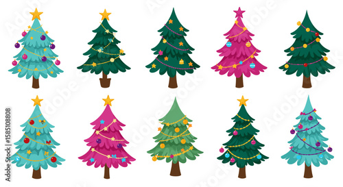 Colorful christmas trees variety with ornaments and stars in festive flat design