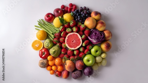 Colorful circle of fresh fruits and vegetables, celebrating nature's bounty and healthy eating.