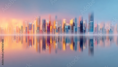 city, skyline, sunrise, water, colourful, building, urban, vibrant, modern, architecture, city landscape, tranquil, calm, fog, mist, hazy, horizon, light, pastel, skyscraper, digital, art, impressionistic, blurred, texture, abstract, high-coloured, impression, perspective, panorama, wide, panoramic, soft, warm, image, graphic, illustration, design