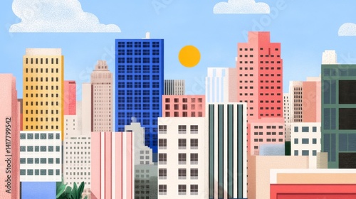 city, city landscape, building, architecture, sky, cloud, sun, urban, colourful, design, illustration, skyline, cartoon, bright, modern, tall, window, facades, graphic, abstract, geometric, texture, background, artistic, high-coloured, playful, fantasy, whimsical, cheerful, optimistic, contemporary, structure, perspective, light, shadow, blue, yellow, pink, green, white, construction, style, vibrant, sunny, day, dynamic