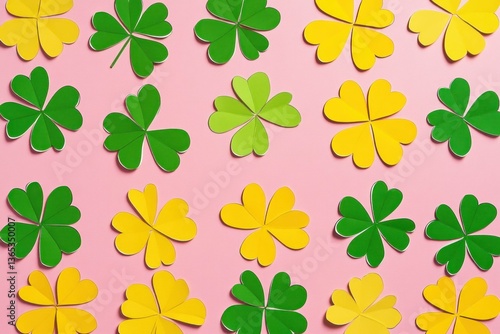 clover, green, yellow, pink, spring, luck, celebration, vibrant, pattern, festive, holiday, decoration, nature, floral, background, creativity, design, joy, freshness, symbol, springtime, warmth, charme, elegance, seasonal, cheerful, happy, bright, playful, art, crafty, concept, harmony, visual, youth, aesthetic, colours, graphic, imagination, youthfulness, paper, texture, arrangement