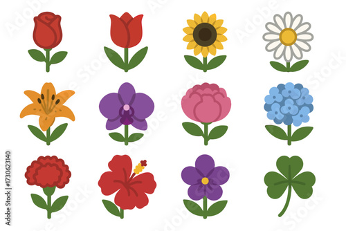 flower, plant, colourful, collection, variety, rose, tulip, sunflower, daisy, lily, orchid, peony, hydrangea, carnation, hibiscus, violet, clover, flower petals, blossom, nature, garden, botanical, floral, bloom, leaf, green, red, yellow, pink, blue, orange, purple, diverse, decoration, natural, vibrant, vector, icon