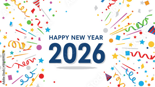 Colorful confetti and streamers celebrate Happy New Year 2026 against a clean white background with joyful and festive mood.