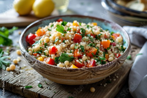 Colorful Couscous Salad with Fresh Vegetables and Herbs - Healthy Vegan Food Diet Meal