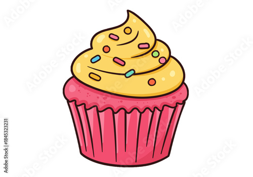 Colorful cupcake with yellow frosting and sprinkles on white background