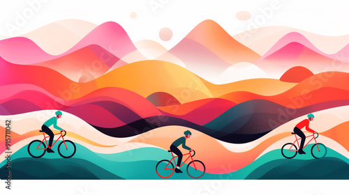 bicyclist, colourful, landscape, vibrant, hill, riding, cycling, outdoors, adventure, sport, fitness, healthy lifestyle, nature, travel, scenery, dynamic, rolling hills, illustration, art, gradient, modern, stylised, exercise, abstract, design, vector, creativity, journey, competition, teamwork, sky, sunset, mountain, sun, sea, water, mountain, cloud, summer, sunrise, desert, cloud, tree, ocean, orange, beach, hill, river
