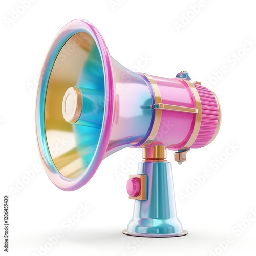 megaphone, colourful, communication, announcement, digital, pink, blue, modern, audio equipment, loudspeaker, reflective, design, vibrant, promotional, event, advertisement, technology, signal, release, noise, instrument, public address, sound, attention, media, playful, eye-catching, stylish, branding, message