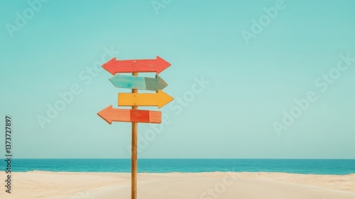 Colorful Directional Signpost at Serene Beach with Clear Blue Sky and Calm Ocean in Background, Symbolizing Choices and Travel Inspirations