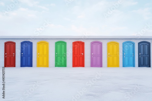 colorful doors standing on infinite white ground, some open some closed, symbol of life choices