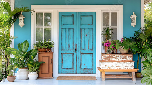 door, plant, tropical, entrance, facades, architecture, caribbean, decoration, exterior, turquoise, doorway, home, style, vintage, potted, botany, palm, cabinet, flora, window, design, culture, rustic, lantern, nature, botanical, decor, detail, wooden, light, nobody, house, front, building, beauty, shutter, garden, container