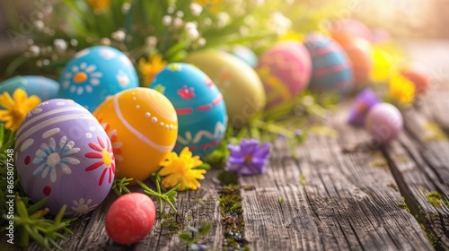 Colorful Easter eggs displayed on a wooden table for an Easter card
